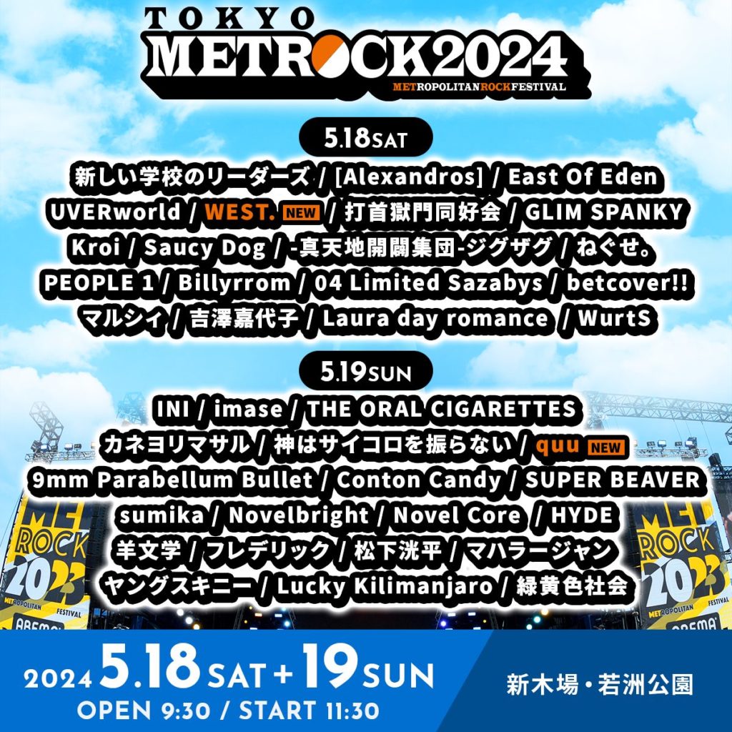 今年もメガ・シティの大阪と東京の2都市で開催する「METROCK2024」、出演アーティストのタイムテーブルを発表、第6弾アーティストとして“WEST.”の出演が新たに決定。