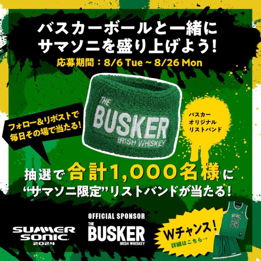 アイリッシュウイスキーブランド『THE BUSKER』は、「SUMMER SONIC 2024」の出店を記念し、バスカーオリジナルグッズが当たるSNSキャンペーン「バスカーボールと一緒にサマソニを盛り上げよう!」を8月6日(火)〜8月26日(月)まで期間限定で実施。また、サマソニ当日のブースビジュアルやコンテンツ詳細も発表!