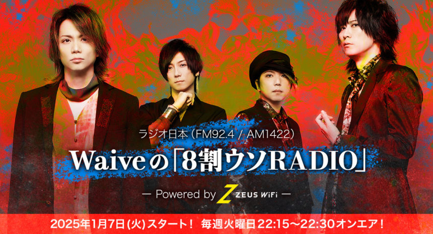 Waiveは、ラジオ日本にて初の地上波ラジオレギュラー番組 【Waiveの「8割ウソRADIO」-Powered by ZEUS WiFi-】 を、本日1月7日(火)より毎週火曜日22:15~の枠で放送することを発表した。