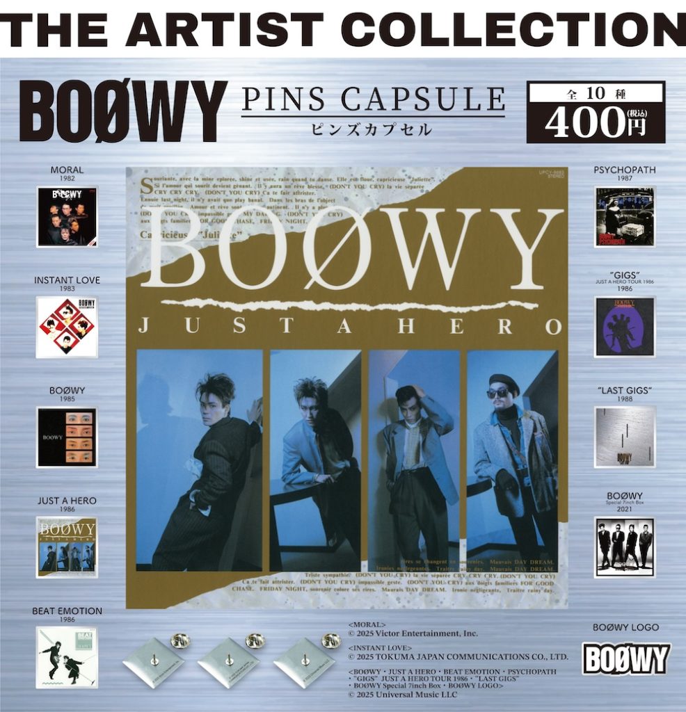 第1弾の3アーティスト(THE BEATLES/QUEEN/DAVID BOWIE)、第2弾の2アーティスト(The Rolling Stones/KISS)、第3弾のBON JOVI、第4弾のAEROSMITH、第5弾の4アーティスト(THE BEATLES/Guns N’ Roses/The Rolling Stones第2弾/DAVID BOWIE第2弾)第6弾のTHE WHOといった伝説的な海外アーティストに続き、このたび、株式会社ローソンエンタテインメント(本社:東京都品川区、代表取締役社長:野口 透)とユニバーサル ミュージック合同会社(本社:東京都渋谷区、社長兼最高経営責任者:藤倉 尚)が共同で企画/制作し、シリーズ第7弾として初の国内アーティストとなる「BOØWY」のカプセルトイ発売が決定。