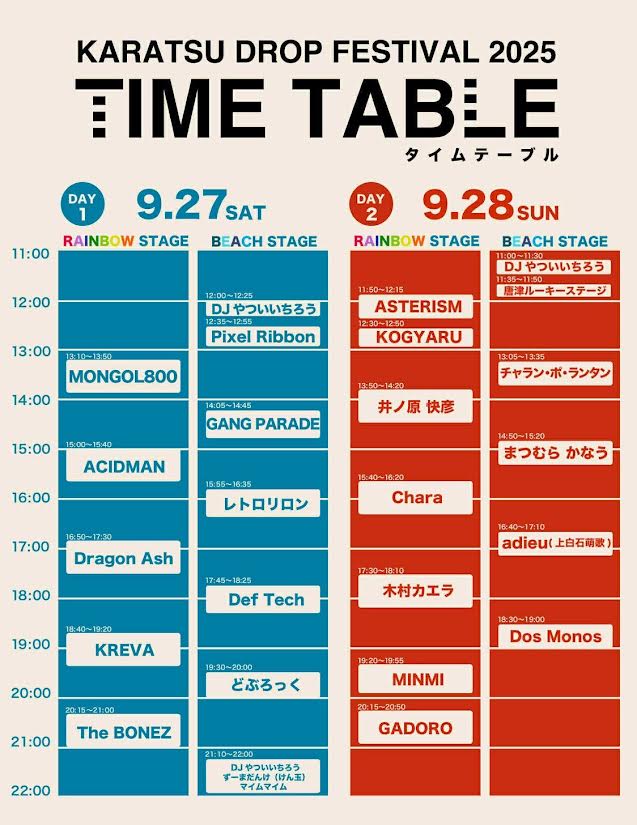 佐賀県唐津市・虹の松原海水浴場 東の浜で9月27日(土)・28日(日)に初開催される「Karatsu Drop Festival 2025」、開催まであと2週間を切り、タイムテーブルが発表された。