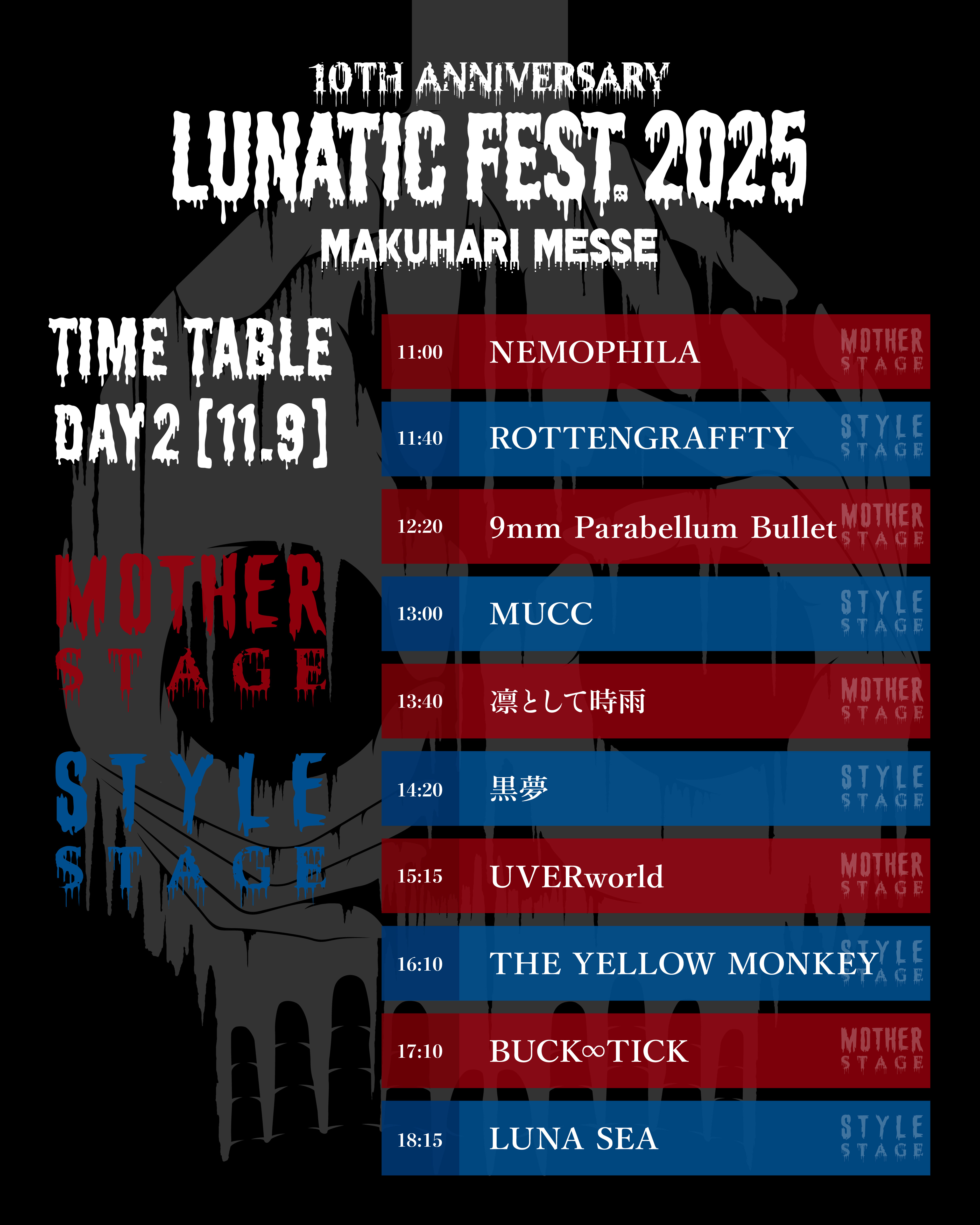 2025年11月8日(土)、9日(日)の2日間、幕張メッセにて開催されるLUNA SEA主催の最狂ロックフェス「LUNATIC FEST. 2025」 のタイムテーブルと出演ステージが公開された。