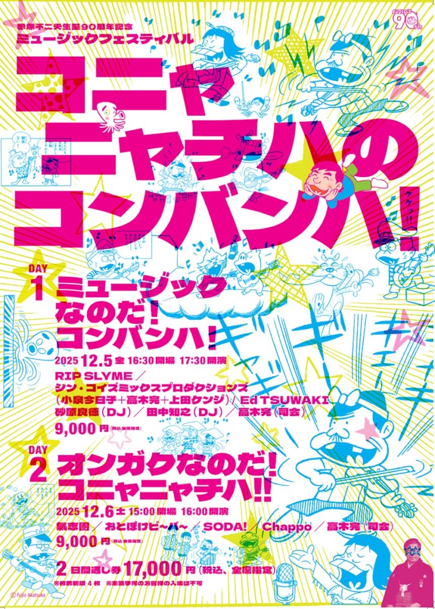 赤塚不二夫の生誕90年を祝って、12月5日&6日に東京・LINE CUBE SHIBUYA(渋谷公会堂)にて「赤塚不二夫ミュージックフェスティバル/コニャニャチハのコンバンハ!」が開催される。