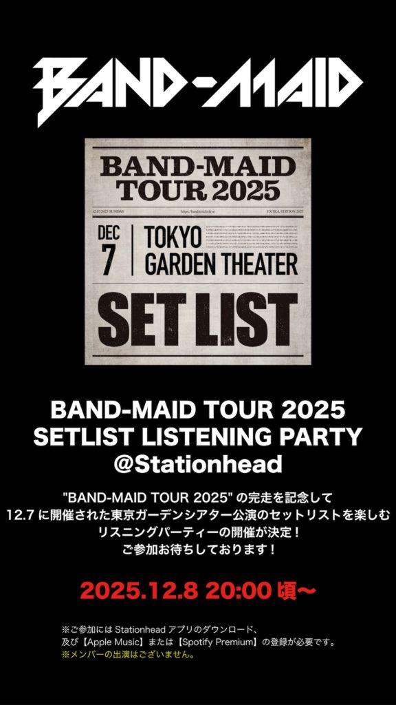 また、BAND-MAIDのSNSでは『BAND-MAID TOUR 2025』のツアーファイナルのセットリストプレイリストが公開された。加えて、12月8日にはこのセットリストプレイリストのリスニングパーティーがStationheadで開催されることも発表されるなど、ツアー終幕後すぐに余韻を楽しむことができる企画が目白押しだ。Stationheadではリアルタイムでチャットを通して他のリスナーと交流することが可能となっているので、ツアーファイナルの熱気をそのままに、奮ってご参加いただき、楽しんでいただきたい。