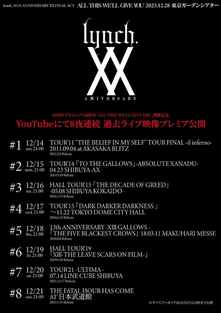 lynch.が12月28日に東京ガーデンシアターでのlynch. 20TH ANNIVERSARY XX FINAL ACT「ALL THIS WE’LL GIVE YOU」開催を記念して、12月14日より8夜連続で過去ライブ映像をYouTubeプレミア公開することが決定した。