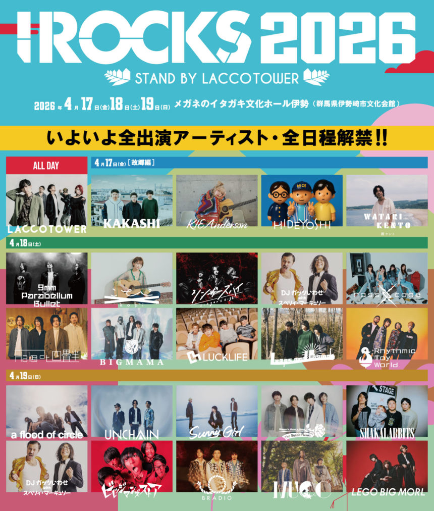 LACCO TOWERが地元・群馬で主催するロックフェス「I ROCKS 2026 stand by LACCO TOWER」の全出演アーティストが出揃い、初日[故郷編]の全貌が明らかとなった。
