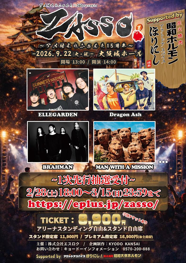 「ZASSO.」開催決定、ELLEGARDEN・Dragon Ash・BRAHMAN・MAN WITH A MISSIONが出演
