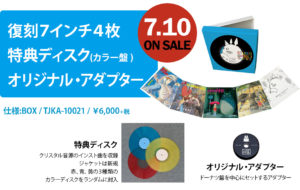 特製のBOXには、7インチレコードで発売された4枚のほか、特典ディスクとして、クリスタルの音で奏でる「君をのせて」と「となりのトトロ」の1枚を合わせた5枚組となっている。