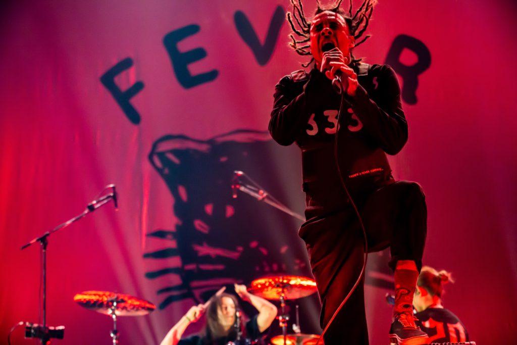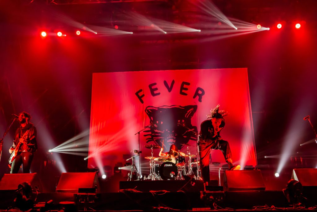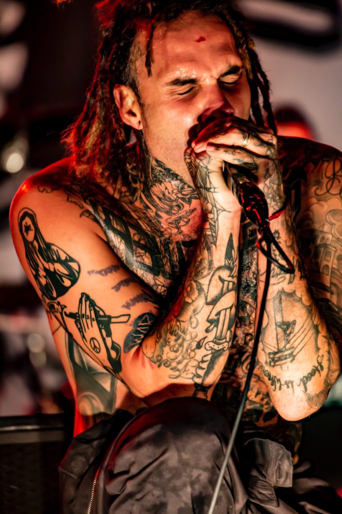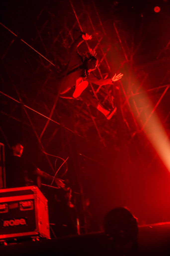 クレイジー過ぎるライヴが評判を呼び、3度目の来日にして初の名古屋上陸を果たしたのは米ロセンザルス発のFEVER333。coldrainも絶賛するバンドの一つで、この日も期待を裏切らない野獣パフォーマンスを叩き付ける。途中、ジェイソン(Vo)は上半身裸になり、モニターの上を飛んだり、機材用ケースに乗ってスケボーのごとく滑ったりとやりたい放題だ。ラスト曲「Hunting Season」に入ると、ジェイソンとステファン(G)はステージ両脇の鉄格子に猿のごとくよじ登り、ステファンに関しては天井近くで上空でギターをブンブン振り回すヤンチャぶりで初見の観客も度肝を抜かれたに違いない。