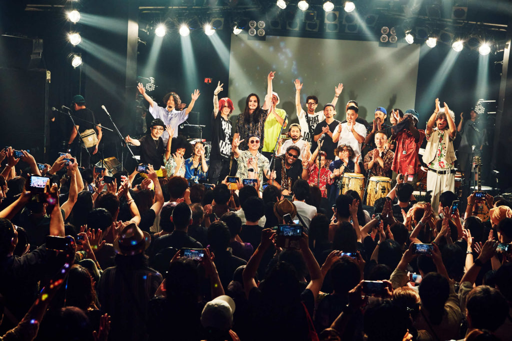 そのSPECIAL OTHERSの演奏が終了すると、ステージにはこの日出演した4つのバンドのメンバー、それにゲスト陣も含めた全員が登場しての一大ジャム・セッションへと突入。20人以上がところ狭しと一同に揃う眺めだけでも壮観だが、E7コード一発によるその場の完全インプロヴィゼーションの上で、それぞれがソロを回していく様も圧巻! 同じドラムを4人のドラマーが代わる代わる叩き、キーボードにはバンドからの鍵盤奏者に加えてモジュラーシンセサイザーで出演していた坪口昌恭も参入。ヴォーカルの女性ふたりもその場で即興の歌詞を付けて歌い、場内は興奮の坩堝と化す。そして、なによりも出演している当事者たちが心からこのイヴェントを楽しんでいるのが伝わってくる象徴的なシーンでもあった。