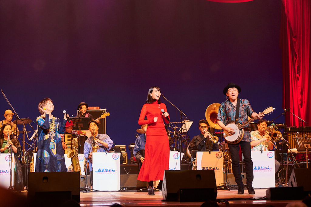続いての「あまちゃんクレッツマー」。スカやチャンチキのビートが織り込まれた楽しさ全開ののんちゃんリクエスト曲。ここで宮本信子は一旦、下手に下がり、ステージに登場したのは、大友と番組音楽制作に携わったSachiko Mに、SPビッグバンドの「じぇじぇガールズ」こと相川瞳、上原なな江。劇中のアイドル・グループ、GMTのレパートリー、「暦の上ではディセンバー」と「地元に帰ろう」を4人でパフォーマンス。もちろん振り付きで。