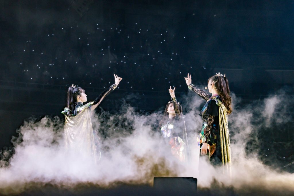 2日目の「21 NIGHT」は、またしても、ライブの導入ソングとなっている「BABYMETAL DEATH」で幕が開けた。続く、「Distortion (feat. Alissa White-Gluz)」と「PA PA YA!! (feat. F.HERO)」で、舞台をセンターステージへ移すと、早くもライブモード全開となった。久しぶりに披露された「Elevator Girl」と「ヤバッ!」では、新鮮さもあいまってハイスピードな展開にオーディエンスが奮起。神バンドのソロコーナーに引き込まれるとオーディエンスからクラップが起こり「Believing」がメインステージで披露された。続く「Brand New Day (feat. Tim Henson and Scott LePage)」では、幻想的な映像演出に引き込まれていった。3rdアルバムより「Starlight」が披露されると、宇宙の広がりを感じさせるようなSU-METALの切なさが漂う真っ直ぐな歌声と透明感溢れる輝かしいコーラスが会場に溢れ、そのまま、同じ世界線で神々しさを称えながら「KARATE」へと曲が繋がりセンターステージへと舞台を移した。意外な展開に新しい景色を見るような時間が過ぎていくと、聞きなれた三味線の音とともに、神バンドのソロがメタ村の夏祭りへとオーディエンスを誘い、パワー全開で「メタリ!! (feat. Tom Morello)」が披露された。昨日と同じ流れで、初期の楽曲「ギミチョコ!!」と「ド・キ・ド・キ☆モーニング」が変わらぬBABYMETALらしさをたたえながら磨きのかかったパフォーマンスに魅せられるとライブは「THE ONE」で終盤を迎えた。「21 NIGHT」ではどのような聖誕の儀式が執り行われるのかオーディエンスが待ちわびる中、MOMOMETALの誕生日でもある3月3日の桃の節句に桃太郎をかけたストーリームービーが流れると、マーチングバンドのBGMにのせて天空からMOMOMETALがセンターステージへと舞い降り、「META !メタ太郎」が披露された。MOMOMETALがセンターで歌い始めるとオーディエンスは驚きと喜びに溢れた声援をおくった。SU-METALがメインボーカルを引き継ぎ、センターステージで3人が回りながら歌うとオーディエンスの大合唱が巻き起こった。大興奮の中、暗転すると、舞台はメインステージへと戻り、全てを受け止め、締め括る壮大な宇宙と未来へ向けた歌「Arkadia」が躍動的なラストを飾り、2日目の幕が下りた。