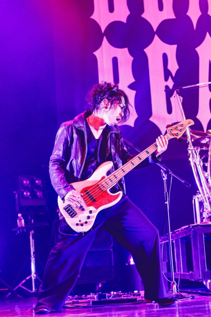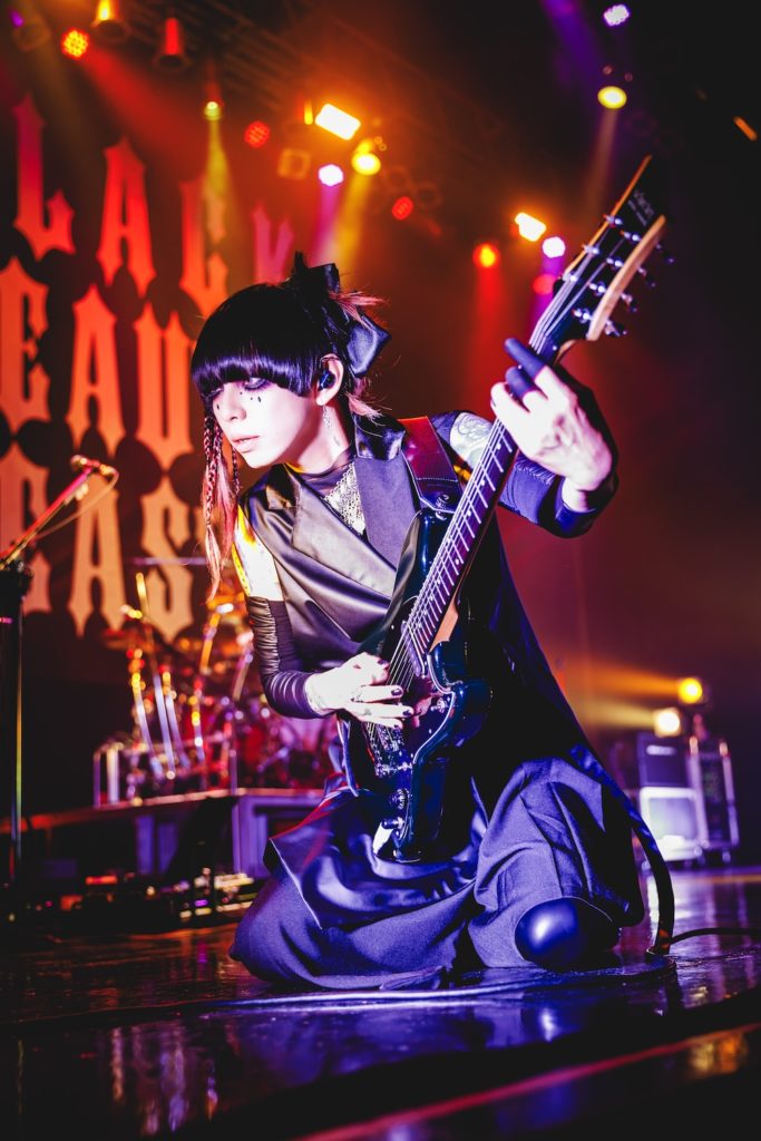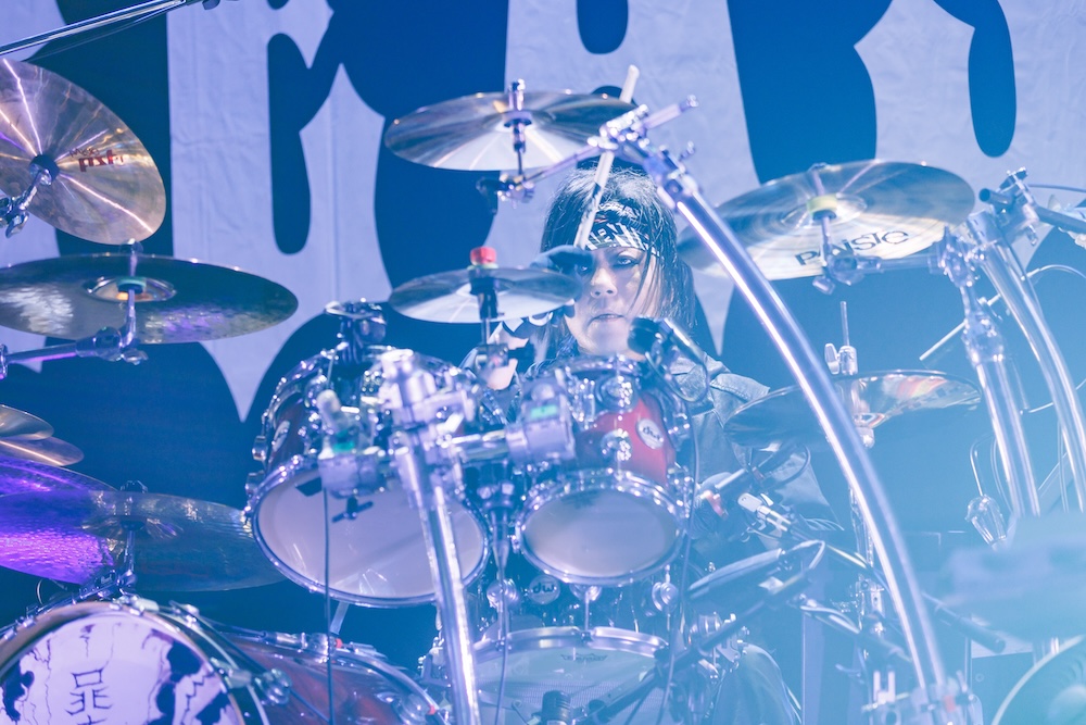 “集団リンチの会”という言葉もあながち間違ってはいないのではと思えてくる程、一切の手加減のない大先輩たちのパフォーマンスを経て、ついに主催者 lynch.の出番がやってきた。真っ黒な衣装を身に纏い、玲央(Gt)、晁直(Dr)、明徳(Ba)、悠介(Gt)、そして葉月(Vo)が姿を現すと、新旧の名曲たちを織り交ぜた全10曲の猛烈な“反撃”が開始。紆余曲折ありながらも確かに20年生き抜いたバンドが、たとえ歴戦の猛者たちからの集中砲火を受けようとも、そう簡単に白旗を上げるわけがない――晁直の安定感のあるドラミングを土台に、明徳はスラップ等で魅せ、玲央と悠介は激しさと奥深さを兼ね備えたギター・サウンドを展開し、その上で葉月が極悪シャウトから艶やかなクリーン・トーンまでを自在に操り、確立されたlynch.らしさを炸裂させることで、これを証明してみせた。