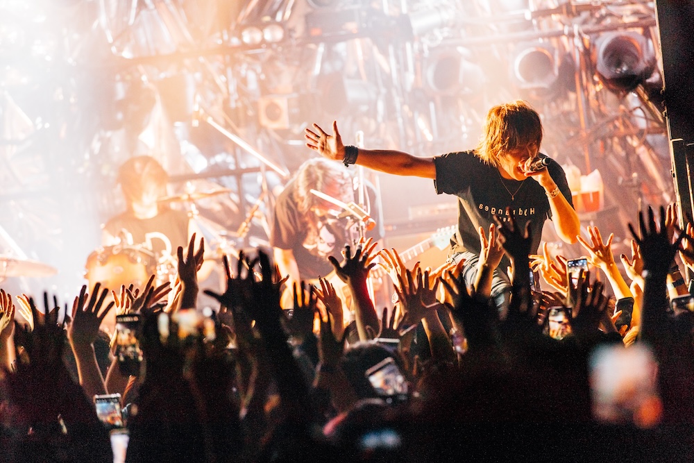 中盤に向かって怒涛の昂りを見せていった「raize」(2006年リリース『photograph』収録)に続き、背後から差し込む色とりどりの透明な閃光を背にして、神秘的なムードの中始まったのは「Cloudiness」。物憂げなギターカッティングから幕開け、INORANの艶やかに響く歌声に導かれ、曲の世界へと深く惹き込まれていく。バンド演奏はこの上なくエモーショナル。INORANの最後のロングトーンは魂の叫びに聴こえた。大拍手の後、すぐに「Walk along」に入り、曲調と共に照明も温かな色に切り替わると、INORANはファン一人一人に語り掛けるように身を乗り出して、真っ直ぐに見つめながら歌唱。自らワイプし、ファンもそれに応えて動きが揃い、瞬く間に一体感が広がっていく。昨年の『BIRTHDAY CIRCUIT ‘24』に続き、今回もTシャツをチケット代わりに入場できる「プレミアム・チケット」を導入しており、揃いのエメラルドグリーンTシャツ姿のファンが多数だったことも一体感に拍車を掛けていた。
