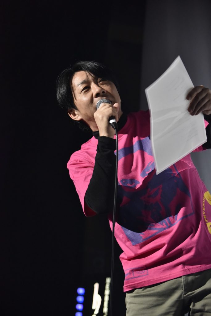 開場時間になるとステージ上のDJブースに、桃知みなみが登場。まだ誰もいないがらんとした客席に向けて、DJを始める。そこへ一人、また一人と、来場者が走りこんでくる。「おはよう」「いらっしゃい」と手を振りながら、声をかける桃知みなみ。良き相棒のパンザブロウもステージに登場して、これから始まるイベントを一緒に楽しむ仲間たちをhideの音楽で暖かく迎え入れているのが微笑ましい。徐々に客席がオーディエンスで埋まっていき、DJタイムが終わる頃には会場はほぼ満員になっていた。