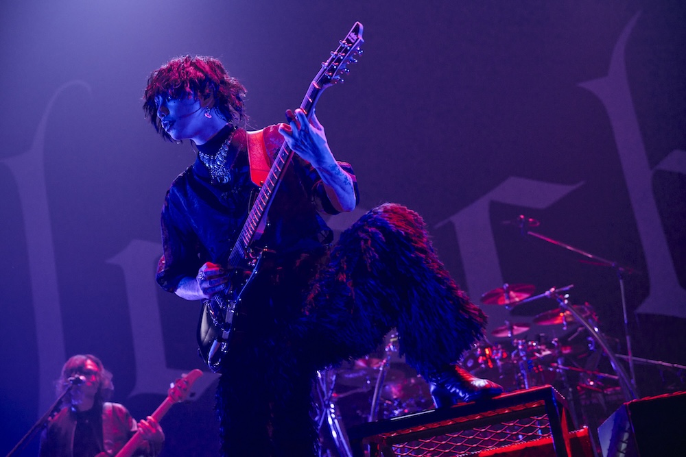 また、容赦のない攻撃性はlynch.の大きな魅力だが、彼らの持ち味はそればかりではない。まさしく万華鏡のように移り変わっていく映像を背にしながら披露された“KALEIDO”から始まった3つ目のブロックにおいては、スピードやアグレッシヴさに答えを求めていない楽曲が続けざまに披露され、このバンドの音楽的な奥行きと多面性が示されていた。テンポ良く続く攻撃の狭間で、ねっとりと絡み付くような空気を醸し出していたこのブロックは、ライヴ全体の物語においては“山”というよりも“谷”の部分にあたるものだが、実はこの部分こそがエモーショナルな意味での肝だったようにも思う。ただ単に明暗のコントラストを演出するだけではなく、今や長い歴史を持つようになったこのバンドならではの説得力、円熟味が感じられる場面でもあった。