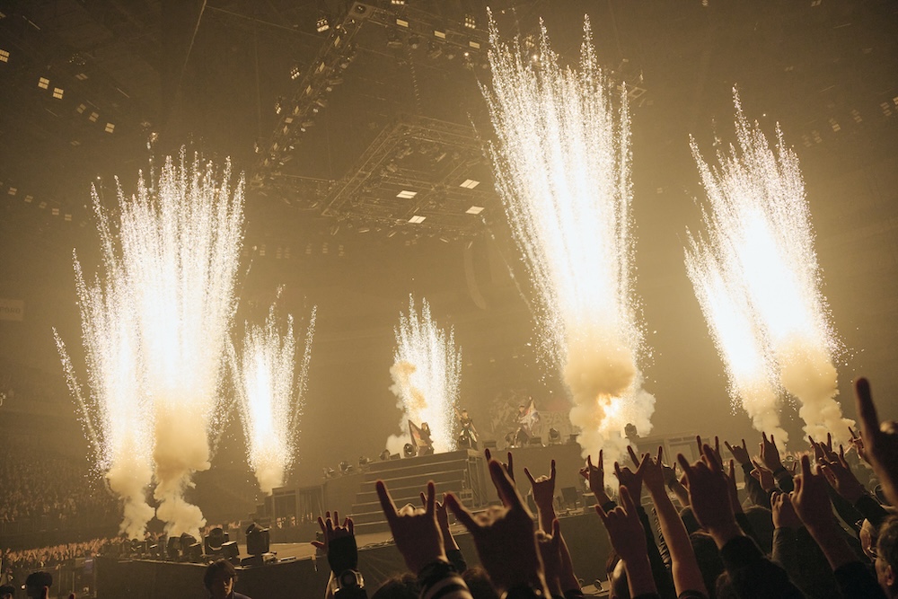 「諸君、首の準備はできているか?15 BABYMETAL YEARSの幕開けだ!」新たなLEGENDの始まりを告げるメッセージと共に「BABYMETAL DEATH」がスタート。メンバーは神バンドが鎮座するサブステージから登場し、SU-METALが15周年の杖を掲げると、センターステージへと向かって炎の道が出現した。新たな歴史のスタートを一歩一歩踏み締めるように前へと進むメンバー。「ド・キ・ド・キ☆モーニング」、「メギツネ」と初期の代表曲に続き、鐘の音が聞こえてくると「Catch me if you can」のドラムのリズムと共に神バンドのソロ演奏が始まり、センターステージを取り囲む回廊から登場したメンバーがオーディエンスを煽ると会場も一段とヒートアップする。さらに「あわだまフィーバー」、「Elevator Girl」へと繋がるメドレー形式で披露され、嬉しいサプライズとなった。「KARATE」では会場全体がひとつになるようなライトに包まれ、「ギミチョコ!!」ではセンターステージがリフトアップされ、熱狂のうちにフィナーレを迎えた。